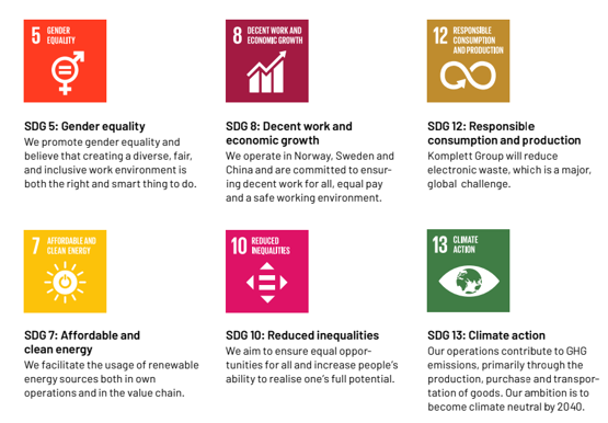 Komplett Group ensures that our business contributes to a more sustainable, inclusive, and responsible future by aligning our efforts across environment, social, and governance areas with the UN Sustainable Development Goals. Our work supports key goals including: